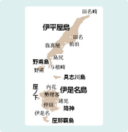 その内、伊平屋島・野甫島の伊平屋地方二島と伊是名島・具志川島・屋那覇島・屋の下島・降神島の伊是名地方五島、両地方合せて、「伊平屋の七離れ」と呼ばれていました。島の呼び方は色々と古書に記され、いぢへな(伊是名)えひや(伊平屋)伊瀬名(伊是名)恵平也(伊平屋)。